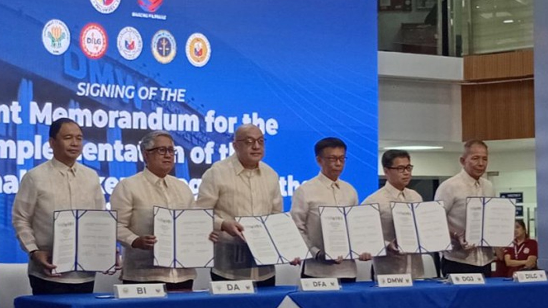 The agreement was signed by officials of the Department of Foreign Affairs, Department of Justice, Department of the Interior and Local Government, Department of Agriculture, and Bureau of Immigration (BI) at the DMW office in Mandaluyong City, formalizing a whole-of-government mechanism for ethical recruitment and worker protection.