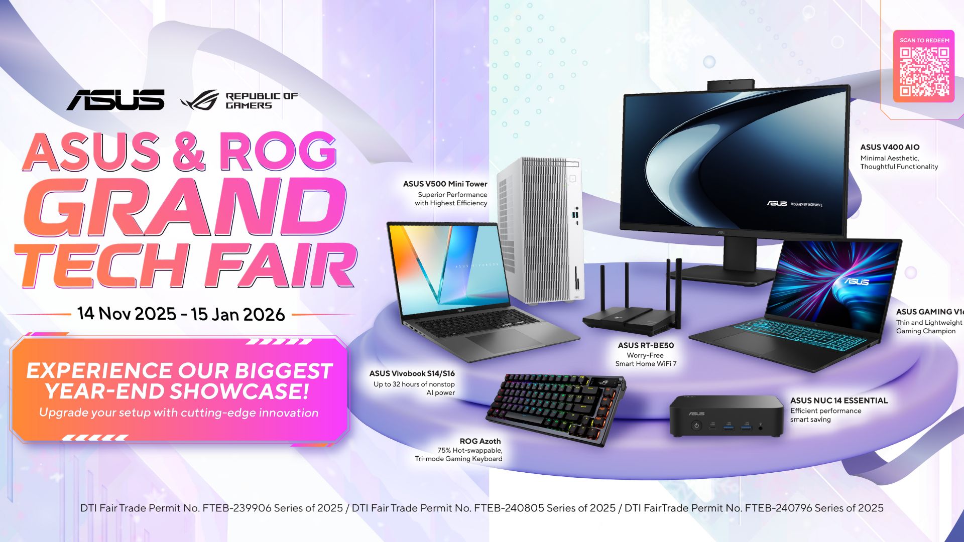 Get ready to upgrade and gear up for the new year starting November 14! For the complete list of qualified products, promo mechanics, participating stores, and event schedules, follow the official ASUS Philippines and ROG Philippines Facebook pages, or check out the ASUS ROG Grand Tech Fair 2025 microsite: https://ph.asus.click/grandtechfair2025.