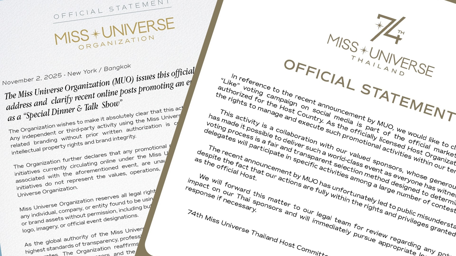 A rare and public disagreement has emerged between the Miss Universe Organization (MUO) and Miss Universe Thailand (MUT) after both parties released official statements offering conflicting explanations about the legitimacy of recent online promotions and voting campaigns.